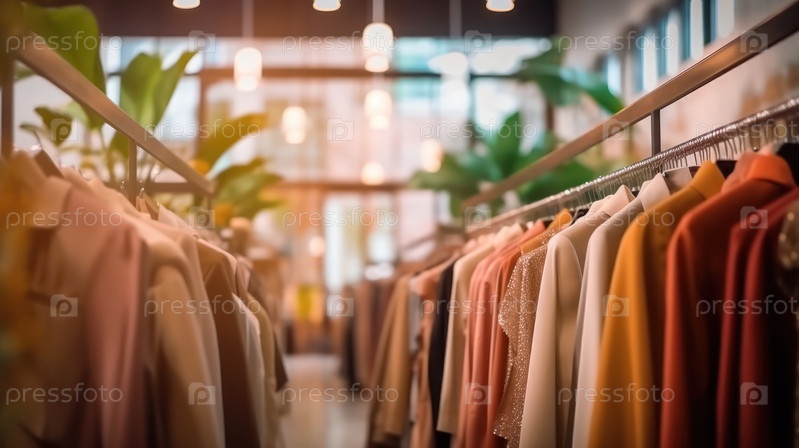 Стильный бутик одежды в пастельных тонах, элегантные стеллажи и яркий дизайн интерьера. Идеально подходит для модной розничной торговли или современных концепций шопинга