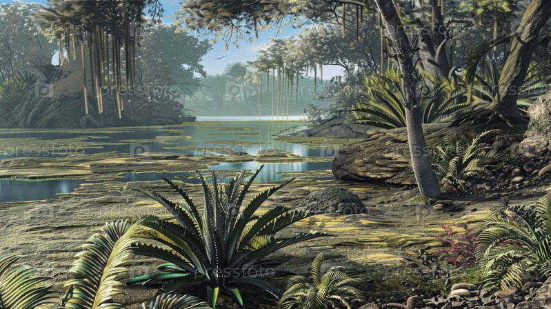 Густой доисторический болотистый ландшафт с яркой зеленью, тропическими растениями и спокойным болотом, окруженным пышной растительностью и отражениями в воде