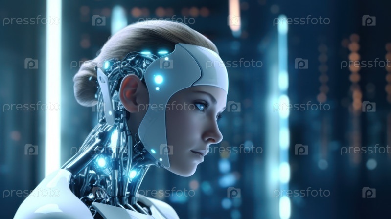 Футуристический женский робот со светящимися неоновыми деталями и гладким кибернетическим дизайном. Передовая технология искусственного интеллекта, сочетающая человеческие черты и инновации в цифровой городской среде