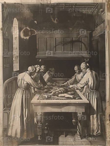 Подробная средневековая гравюра медицинской операции. Черно-белая сцена с врачами, инструментами и анатомическими исследованиями, отражающими историю, науку и традиционное мастерство