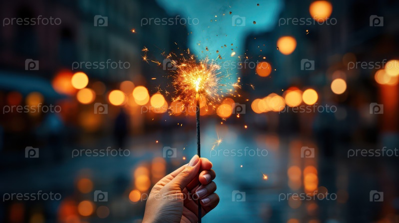Яркий бенгальский огонь освещает ночь праздничным сиянием, передавая дух праздника, волнения и праздничного настроения с красивым фоном боке