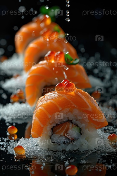 Динамичная композиция из роллов с суши, лососем и икрой, подвешенных в воздухе, идеально подходит для фуд-фотографии, японской кухни и гурманских визуальных образов