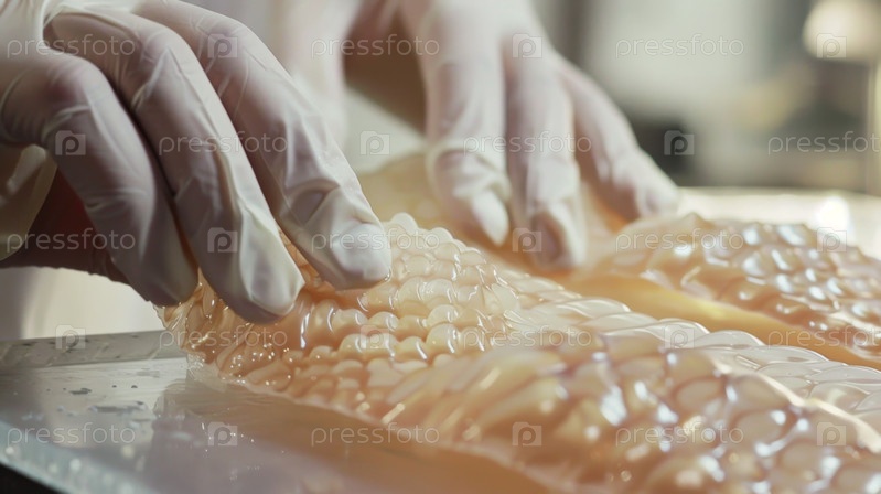 Подробный крупный план искусственной кожи с уникальными текстурами, обрабатываемой в лаборатории, представляющей биомедицину, инновации и научные исследования