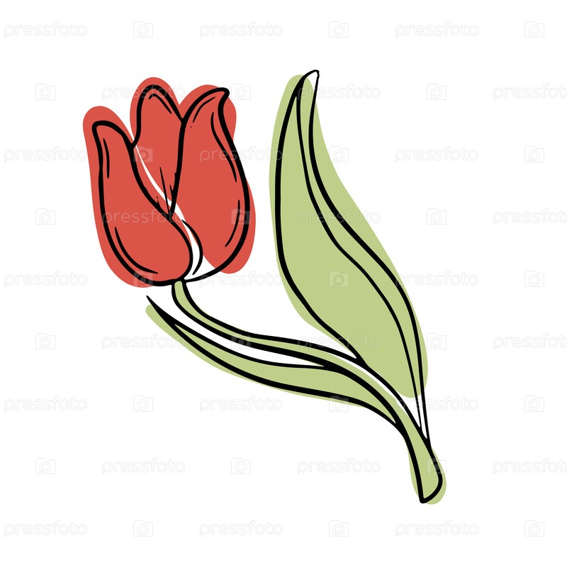 Элегантный красный тюльпан с зелеными листьями в нежном рисованном стиле. Простая цветочная иллюстрация, символизирующая весну, красоту и очарование природы