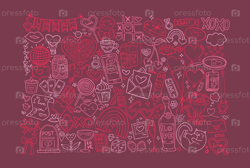 Романтичный рисунок с сердечками, подарками, любовными письмами, кексами и кольцами. Подробный узор ко Дню святого Валентина с розовыми и красными элементами, нарисованными вручную, полными любви и очарования
