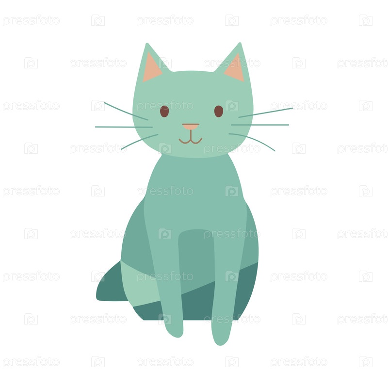 Милый мультяшный кот бирюзового цвета сидит со счастливым выражением лица, изолированный на белом фоне
