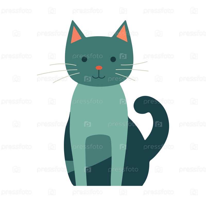 Милый зеленый мультяшный кот с оранжевыми ушами и носом, счастливо сидящий с закрученным хвостом