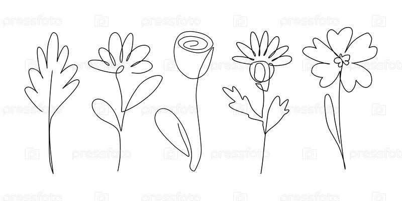 Минималистичный линейный рисунок различных цветов и листьев черным цветом на белом фоне