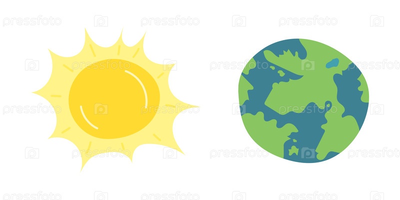 Яркая плоская иллюстрация солнца и земли. Идеально подходит для экологии, осведомленности об изменении климата, возобновляемых источниках энергии, глобальном потеплении и экологическом образовании
