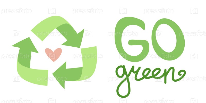 Текст Go Green с стрелками переработки и знаком сердца.Чистая иллюстрация, поддерживающая экологическую осведомленность, возобновляемые ресурсы, экологический образ жизни и ответственность за окружающую среду