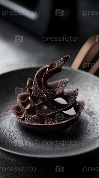 Скульптурный 3D-печатный шоколадный десерт с футуристическим дизайном элегантно расположен на матово-черной тарелке.Темные тона и нежные изгибы создают драматическую подачу
