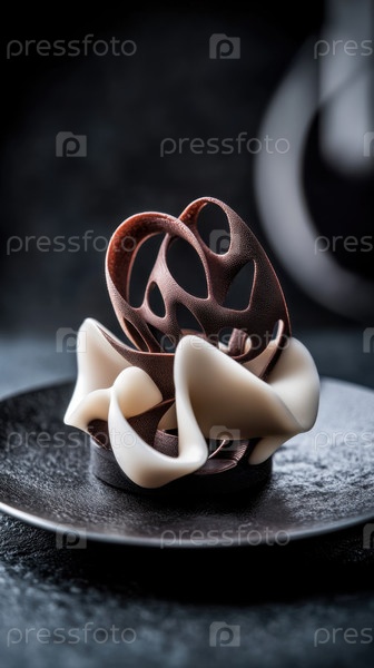 Элегантная 3D-печатная шоколадная скульптура на темной тарелке. шедевр изысканного десерта для кондитерских изделий, изысканные блюда, художественное оформление еды и роскошные кулинарные презентации