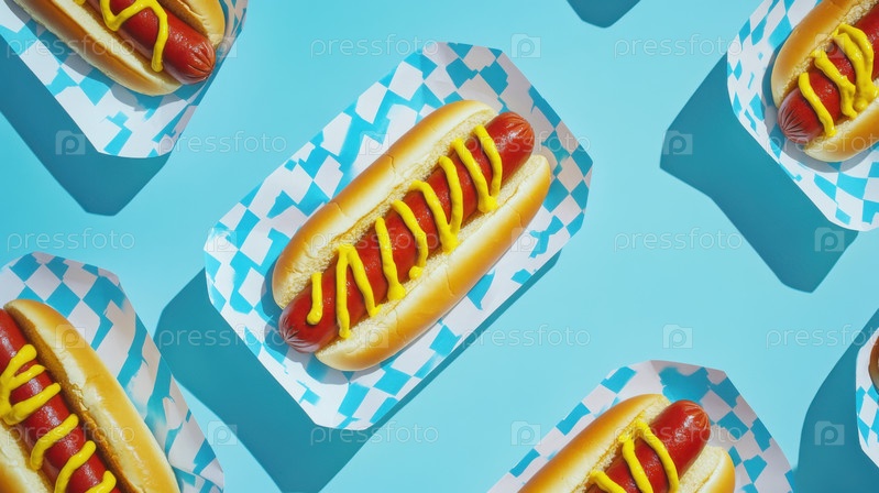 Классический хот-дог с горчицей на мягкой булочке, подается в бумажном подносе. Идеально подходит для любителей фастфуда, пикников, летних пикников, фестивалей и любителей уличной еды