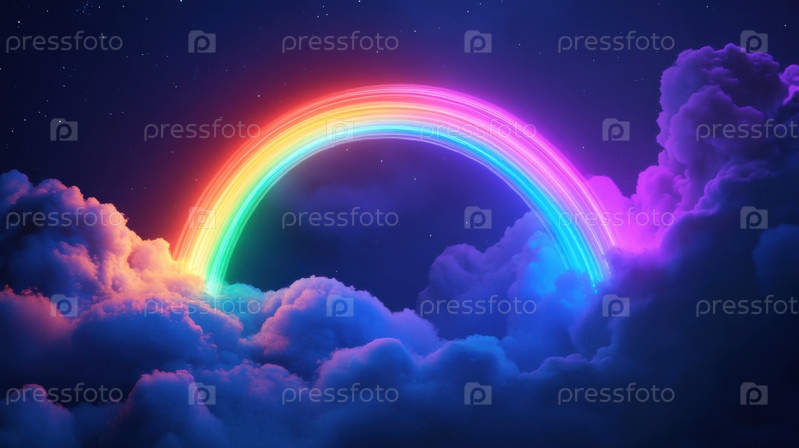 Светящиеся неоновые радужные дуги над мечтательными ночными облаками. Яркий спектр освещения создает сюрреалистическую, магическую и небесную фантастическую сцену неба