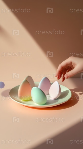 Пастельные яйца на белой тарелке с мягкими тенями. Минимальный абстрактный декор, идеально подходящий для современной весны, пасхи и креативного дизайна