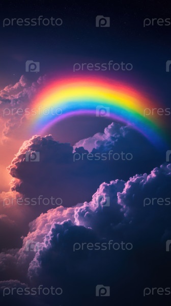 Яркие неоновые радужные арки над мечтательными облаками в сюрреалистическом ночном небе. Волшебная фэнтезийная сцена, идеальная для космических, небесных и атмосферных художественных и дизайнерских проектов