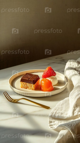 Элегантная десертная тарелка с шоколадным тортом, глазированными фруктами и клубничным муссом на мраморном столе. Изысканное угощение, идеально подходящее для роскошных обедов и любителей выпечки