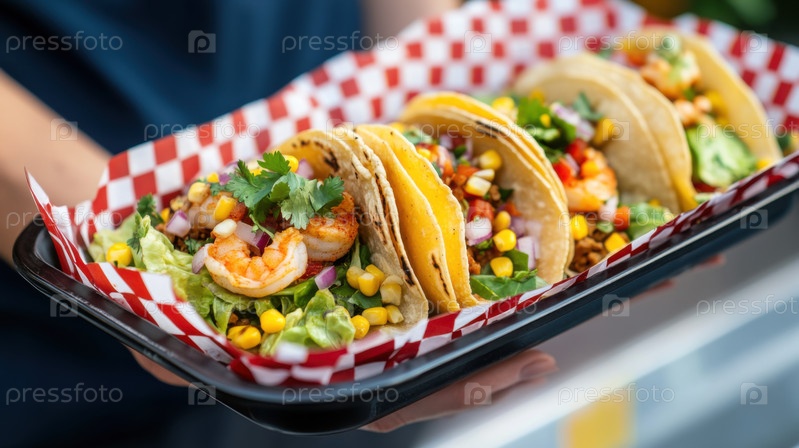 Свежие креветки тако, наполненные жареными морепродуктами, кукурузой, кинзой, луком на желтых лепешках. Концепция уличной еды, яркое мексиканское блюдо, здоровая красочная еда
