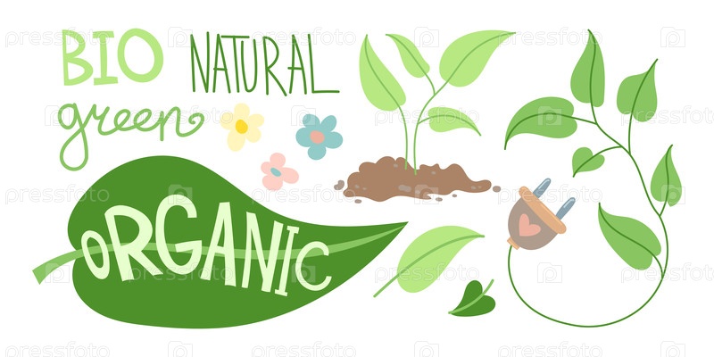Иллюстрация концепции эко с био, органическим и зеленым текстом, с растениями, листьями, цветами и вилкой питания. Продвигает возобновляемую энергию и устойчивость