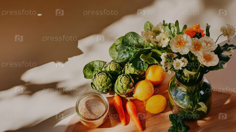 Кухонный стол в деревенском стиле с ярким шпинатом, артишоками, лимонами, морковью, семенами чиа и свежими цветами, оформленными в духе натурального, органического образа жизни «от фермы к столу»
