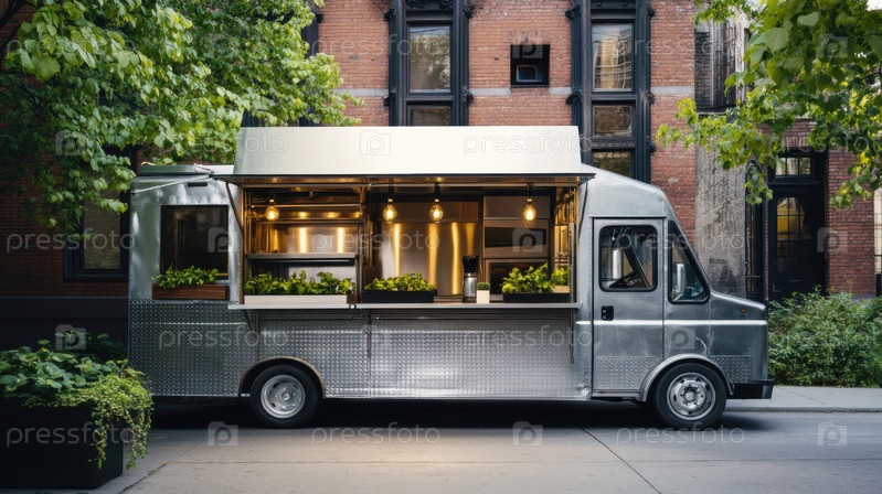 Элегантный металлический фургончик с едой, припаркованный на зеленой городской площади, предлагает экологичную уличную еду, свежую зелень, мобильную еду и современные кулинарные инновации