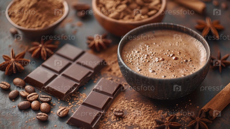 Дымящаяся чашка горячего шоколада в окружении плиток темного шоколада, кофейных зерен, корицы и звездчатого аниса вызывает ощущение тепла, удовольствия и уюта в зимнее время
