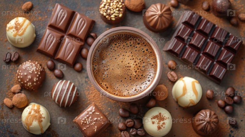 Роскошный кофе в сочетании с богатыми шоколадными плитками, трюфелями и какао-бобами. Идеальное угощение для любителей десертов, демонстрирующее изысканные пристрастия