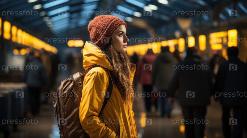Стильная путешественница в желтой куртке ждет в оживленном терминале аэропорта с ярким освещением и энергией путешествия. Идеально подходит для концепций путешествий или приключений