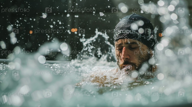 Спортсмен в ледяной ванне, капли замерзли в воздухе, запечатлевая стойкость и сосредоточенность спортивного восстановления на фоне сверкающих брызг воды