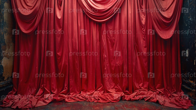 Роскошные красные бархатные занавеси элегантно драпируются на театральной сцене, создавая драматическую и классическую атмосферу для представлений или кинематографических постановок