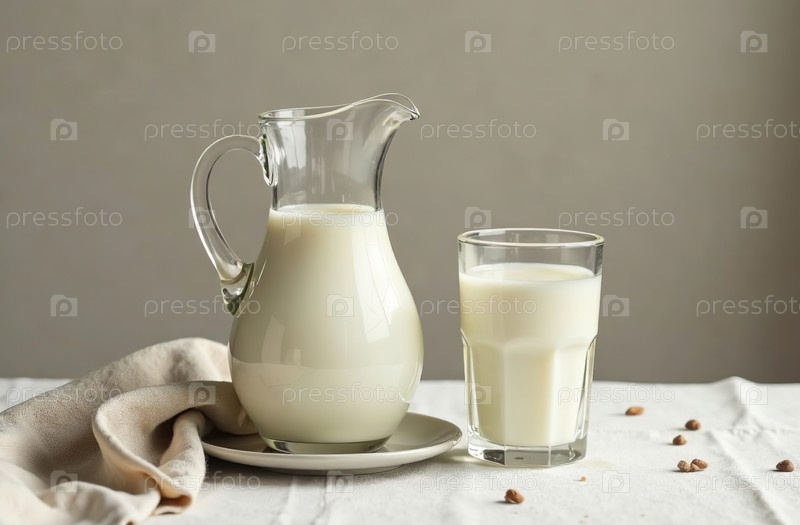 Кувшин и стакан молока светлый фон, фото напитка ресторан. Генеративный искусственный интеллект