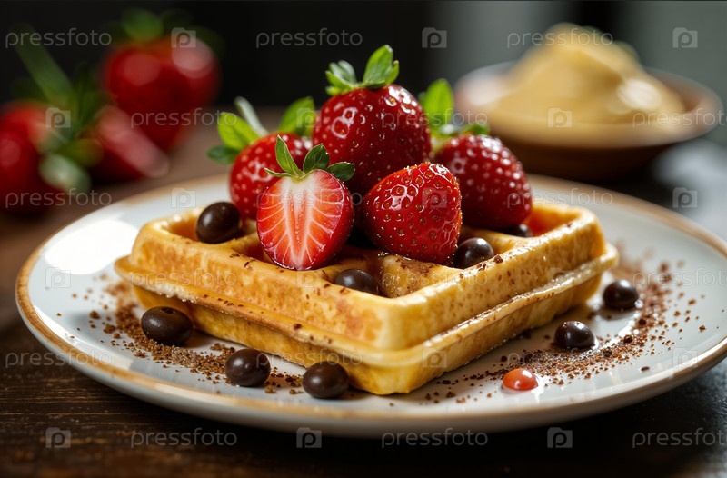 Квадратная бельгийская вафля с клубникой, фото еды для ресторана. Генеративный искусственный интеллект
