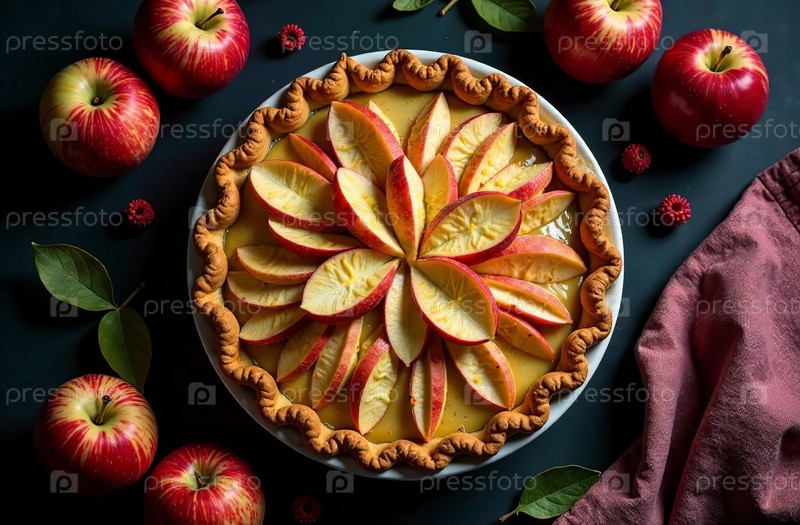 Яблочный пирог из цельных фруктов, фотография десерта для пекарни-ресторана. Генеративный искусственный интеллект