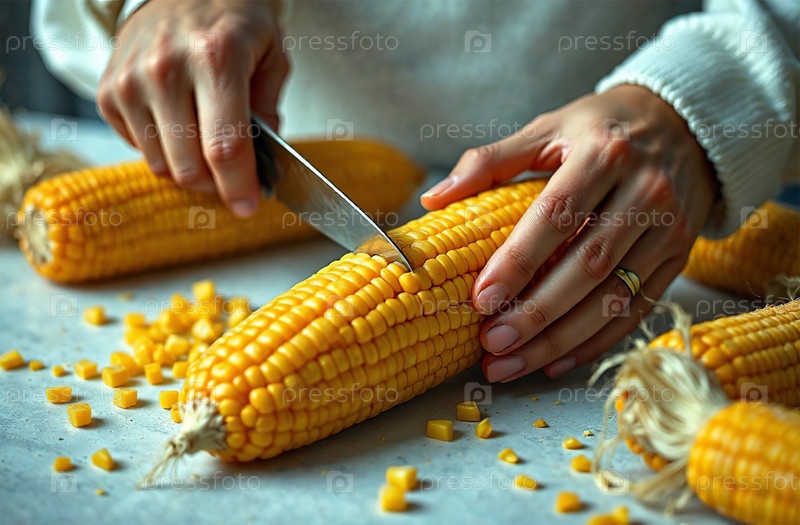 Повар режет кукурузу на кухне, готовит еду в ресторане. Генеративный искусственный интеллект