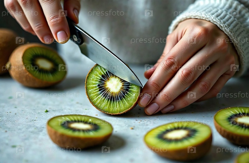 Повар режет киви на кухне, готовит еду в ресторане. Генеративный искусственный интеллект