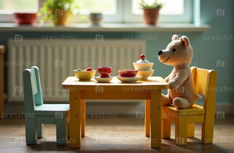 Игрушечный плюшевый мишка сидит за детским столом, игра для чаепития. Генеративный искусственный интеллект