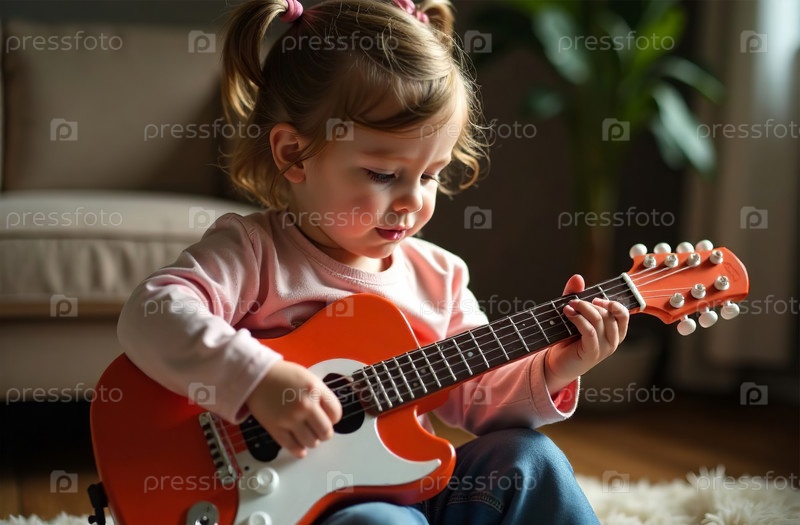 Ребенок играет на игрушечной гитаре, молодой музыкант играет музыку в игровой комнате. Генеративный искусственный интеллект