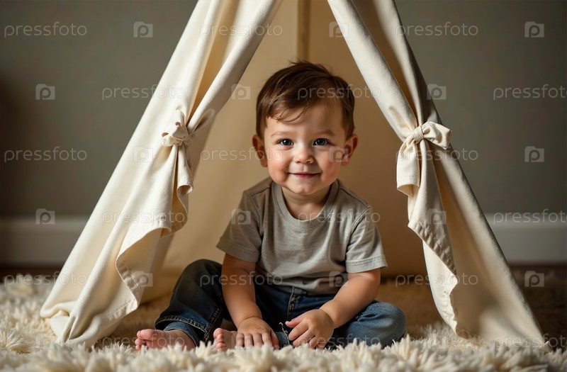 Ребенок сидит в детском вигваме на белом ковре в игровой комнате. Генеративный искусственный интеллект