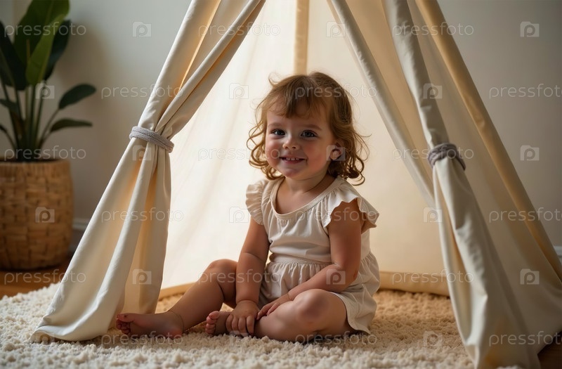 Ребенок сидит в детском вигваме на белом ковре в игровой комнате. Генеративный искусственный интеллект