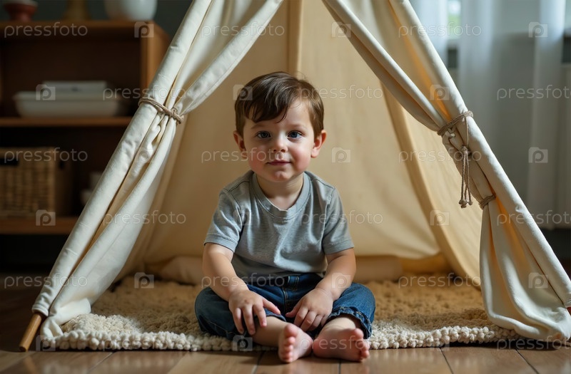 Ребенок сидит в детском вигваме на белом ковре в игровой комнате. Генеративный искусственный интеллект