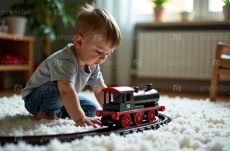 Игрушечный поезд на белом ковре в игровой комнате, ребенок играет с железной дорогой. Генеративный искусственный интеллект