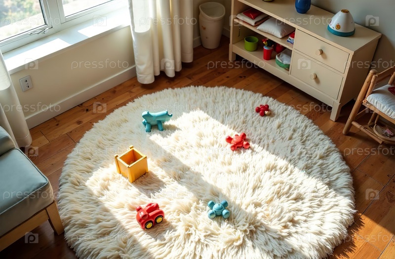 Детская игровая комната, красочные игрушки лежат на белом круглом пушистом ковре в спальне. Генеративный искусственный интеллект