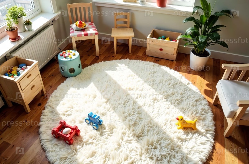 Детская игровая комната, красочные игрушки лежат на белом ковре в спальне. Генеративный искусственный интеллект