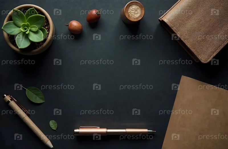 Flat Lay Office Desktop черный фон, минималистичные канцелярские принадлежности. генеративный искусственный интеллект