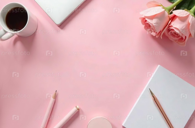 Flat Lay Office Desktop розовый фон, минималистические канцелярские принадлежности. генеративный искусственный интеллект