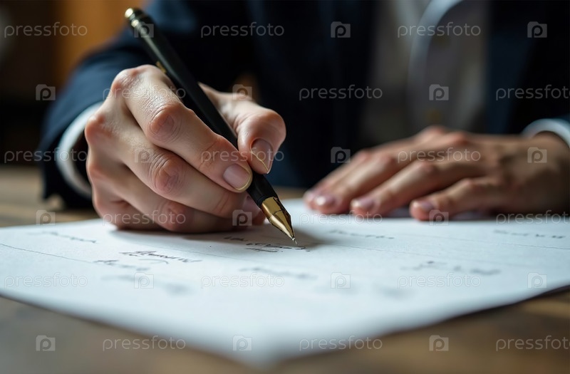 Рука держит ручку и подписывает документ, рабочий стол бизнесмена. Генеративный искусственный интеллект