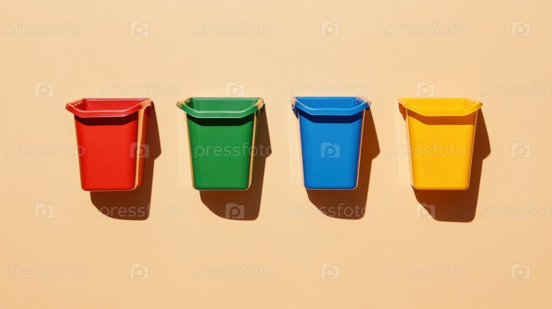 Четыре красочных контейнера для вторичной переработки на бежевой стене для сортировки отходов, пропаганды устойчивого развития, практики нулевых отходов, экологичных решений и повышения уровня экологической осведомленности