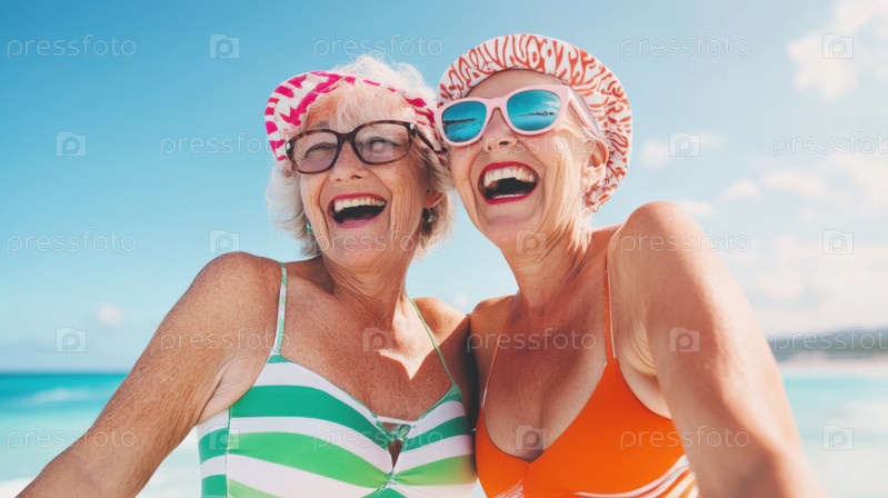 Радостные пожилые женщины в красочных купальниках смеются на солнечном пляже. Яркое небо, океанские волны, солнцезащитные очки и яркая энергия запечатлены