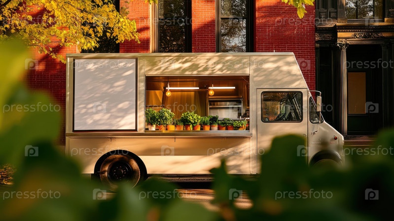 Современный белый фургончик с едой припаркован на городской улице, яркие травы в горшках в окне. Концепция городской уличной еды, мобильный продавец, свежие продукты с фермы на стол, устойчивая тема