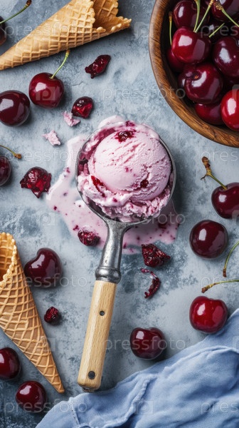 Вкусное вишневое мороженое в винтажном шарике, окруженное спелой вишней, вафельные рожки на текстурированном сером фоне. Плоская выкладка деревенского десерта, атмосфера ремесленной еды